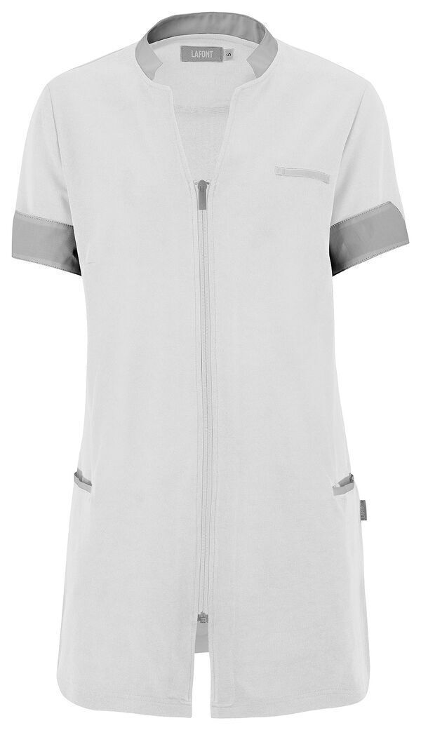 Tunique femme. Col biseauté, fermeture par zip milieu devant. 2 poches côtés et 1 passant pendoir côté droit. Hautes fentes côtés laissant apparaître le fond de poche contrasté. Œillets brodés d'aération sous les bras, manches courtes avec fente biseautée et bas de manches avec parement intérieur contrasté. Longueur : 75 cm.