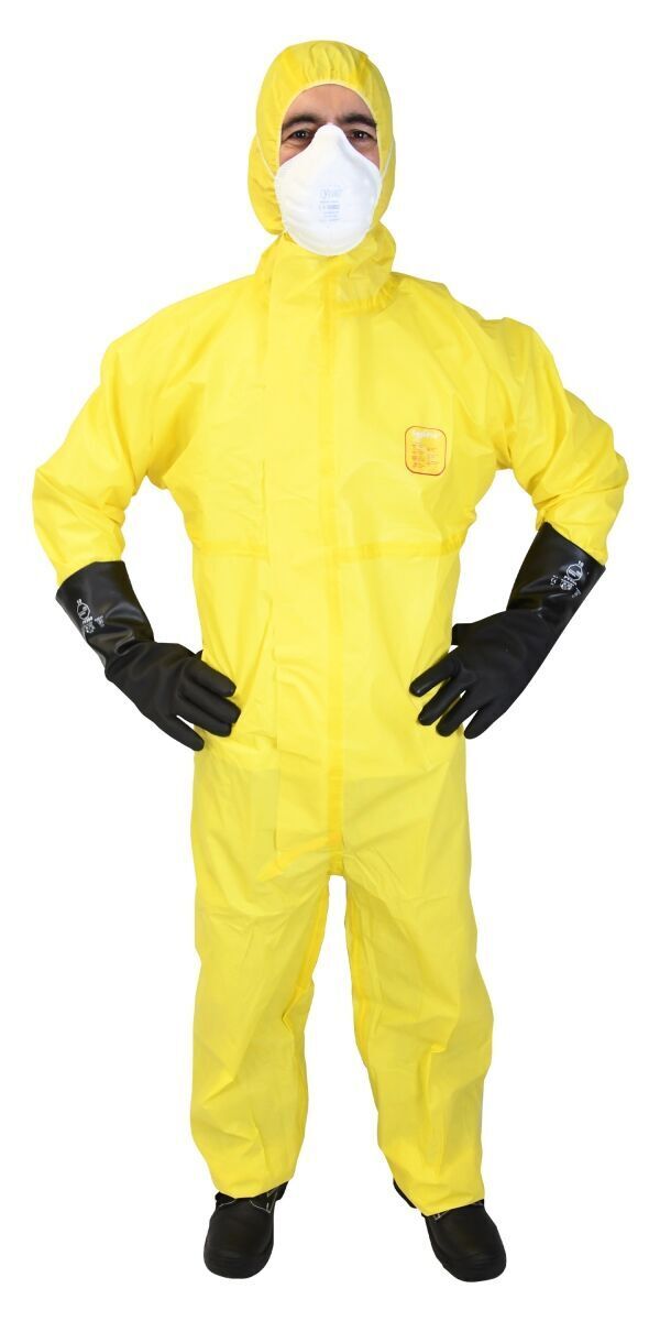 Combinaison avec capuche élastiquée 3 pans. Taille, chevilles et poignets élastiqués. Passe-pouce intégré, rabat adhésif sur le menton. Double fermeture à glissière.