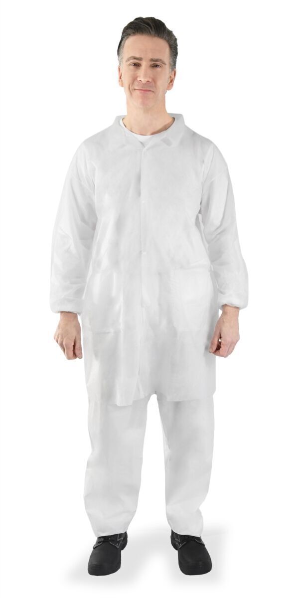 Blouse cousue mixte. Col chemisier. Fermeture par 4 boutons-pression. 2 poches basses plaquées. Poignets élastiqués.