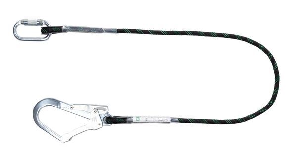 Longe de retenue en corde tressée 11 mm. Longueur : 1,50 m. Équipée d'1 mousqueton acier à vis et 1 connecteur acier ouverture double action 50 mm. Boucles cossées. Coutures protégées sous gaine transparente.