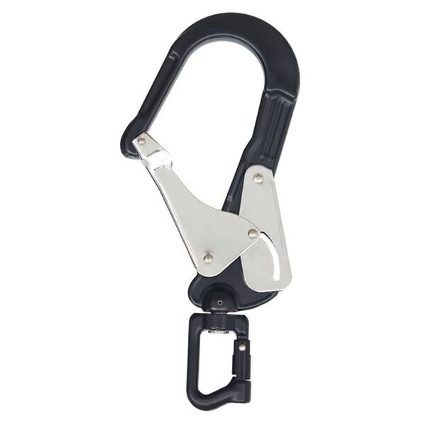 Mousqueton d'échafaudage aluminium, ouverture 60 mm, verrouillage automatique double action. Œil de connexion monté sur émerillon ouvrable par vis pour fixer boucle cossée. Témoin de chute. | Équipé d'un émerillon.