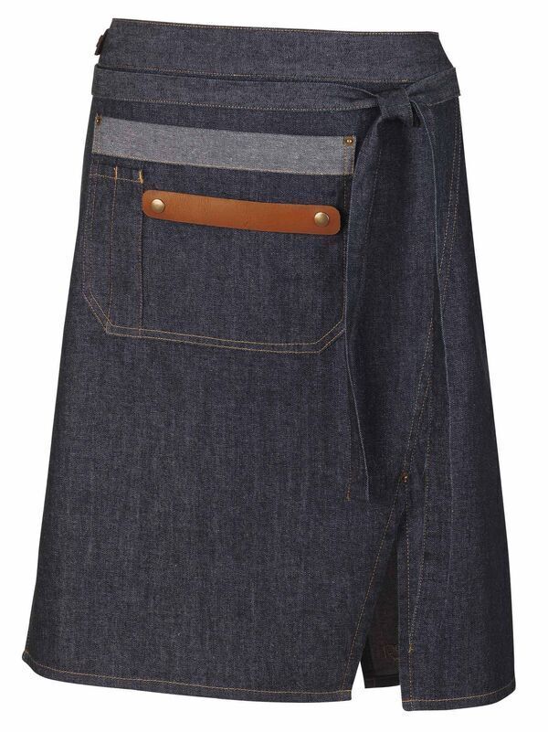 Tablier court en denim. 2 grandes poches côtés. Liens taille à nouer et passe torchon en cuir détachable. Fente d'aisance.