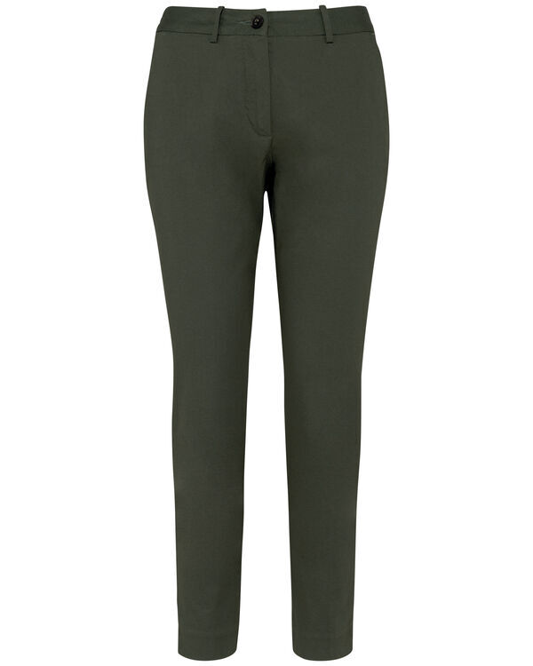 Pantalon chino. Fermeture braguette zippée et bouton cousu. Ceinture avec 5 passants. 2 poches italiennes. 2 poches arrières passepoilées. Ourlet invisible et fentes côtés. Coupe moderne, longueur 7/8ème. Finition peau de pêche.