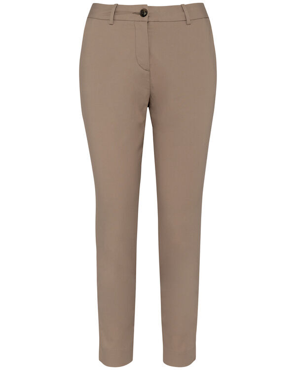 Pantalon chino. Fermeture braguette zippée et bouton cousu. Ceinture avec 5 passants. 2 poches italiennes. 2 poches arrières passepoilées. Ourlet invisible et fentes côtés. Coupe moderne, longueur 7/8ème. Finition peau de pêche.