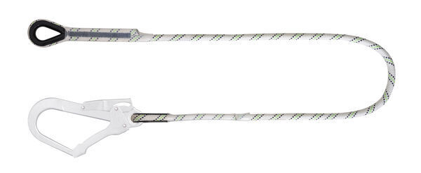 Longe de retenue en corde tressée 12 mm. 1 mousqueton d'échafaudage à verrouillage automatique ouverture 50 mm. Boucles cossées. Coutures protégées sous gaine transparente.