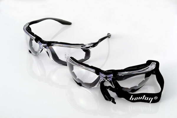 Lunettes de protection incolores. Mousse confort amovible pour être plus près du visage. Système de montage facile "simple clic". Livré avec une tresse et deux branches. | Modulables : élastique ou branches.