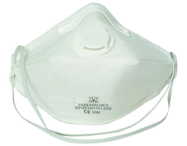 Masque pliable en polypropylène non tissé avec soupape d'expiration. Élastique de serrage en caoutchouc synthétique sans latex. Barrette nasale réglable.