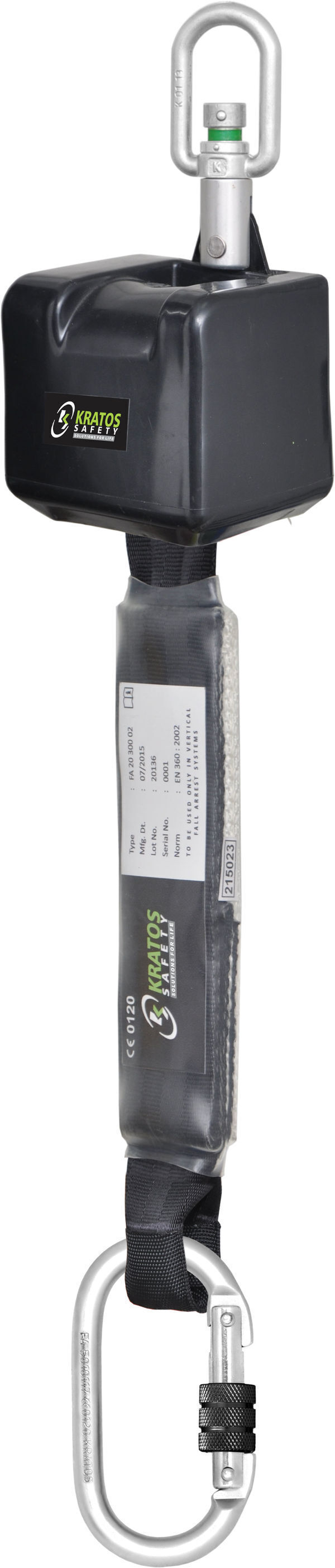 Enrouleur à rappel automatique longueur 2,5 m. Carter PVC équipé d'un émerillon avec témoin de chute, avec sangle polyester largeur 50 mm et un mousqueton standard acier. | Testé 140 kg
