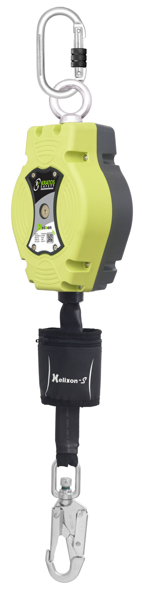 Enrouleur à rappel automatique HELIXON-S. Carter polymère équipé d'un émerillon, avec sangle polyester largeur : 25 mm. Longueur : 6 m. Spécial arête vive. Mousqueton tournant, double sécurité, avec témoin de chute. Fenêtre amovible sur carter permettant de visualiser l'état du mécanisme. | Testé 140 kg