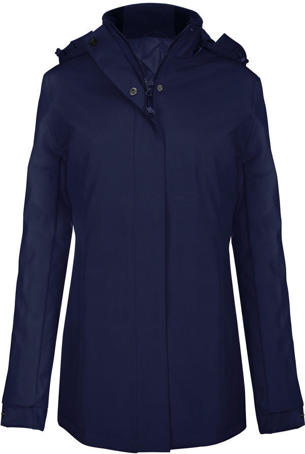 Parka doublure matelassée. Coupe femme. Capuche dans le col. Fermeture centrale à glissière sous patte auto-agrippante et pressions invisibles. 2 poches extérieures zippées, 2 poches intérieures, 1 poche téléphone.