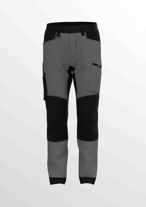 Pantalon bi-matières mixte. Ceinture 5 passants élastiquée aux côtés. Fermeture braguette zippée et bouton. Anneau en D. 2 poches avant. Poche mètre flottante bi-compartimentée tissu Oxford. Poche cuisse plaquée zippée. Renforts genoux Oxford. Réhausse dos. Triple surpiqûre à l'entrejambe. Empiècements 4-way stretch fessier, arrière genoux et entrejambe. E.J.: 82 cm + 5cm.
