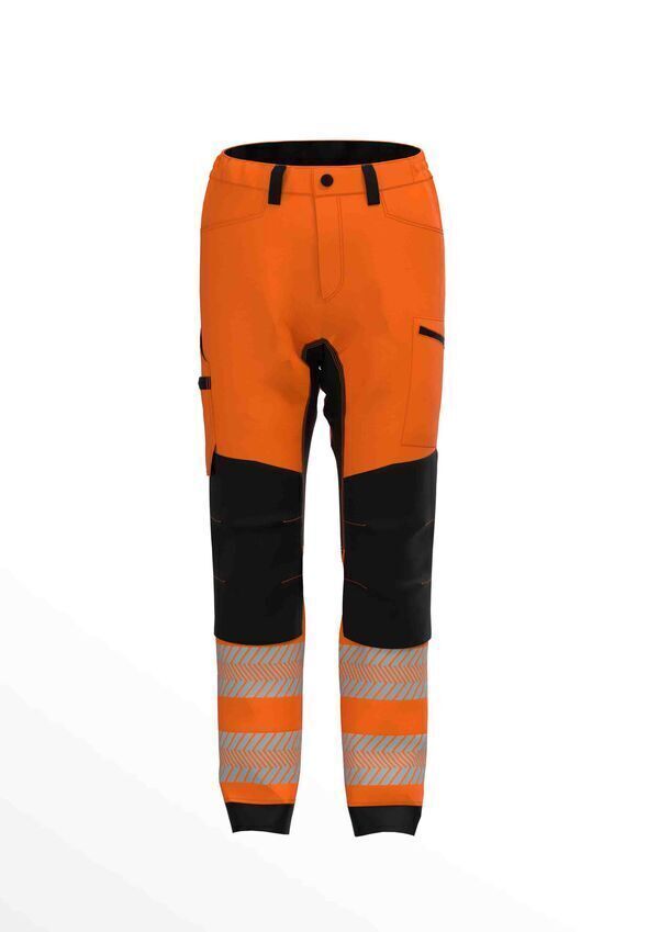 Pantalon haute visibilité bi-matière stretch. Ceinture élastiquée aux côtés avec passants. Fermeture zippée et bouton clou. Poche mètre. Poches cuisse avec plusieurs compartiments. Empiècements full stretch à l'entrejambe, fessier et arrière des genoux. Renfort genoux oxford 600D. Bandes rétroréfléchissantes segmentées.
