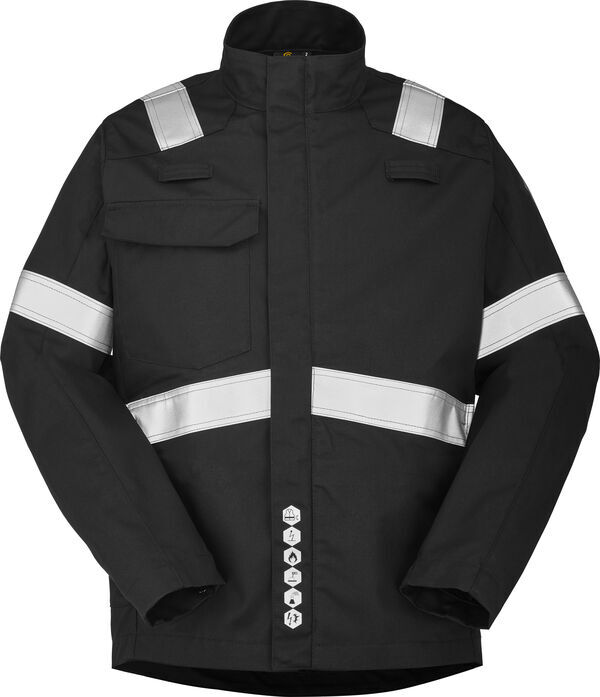 Blouson ATEX REFLECT. Col montant. Fermeture milieu devant zippée sous-patte fermé par pressions cachées. 2 passants porte-dosimètre. 1 poche poitrine droite sous rabat fermé par pression cachée. 2 poches basses insérées dans découpes côtés, fermées par zip. Collerette de marquage intérieur dos. Bas de dos rallongé. Manches longues avec bas de manche fermé par pression intérieure. Bandes rétroréfléchissantes de 50mm.
