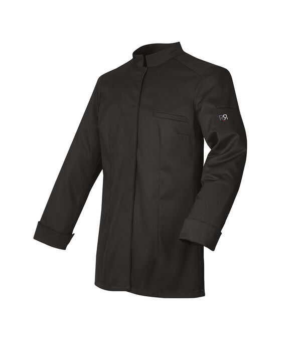 Veste de cuisine femme à col officier contrasté. Fermeture milieu devant par bouton-pression cachés, liseré contrasté. Poche poitrine avec liseré contrasté. Pinces poitrine. Côtés en maille. Manches longues avec poche stylo sur manche gauche et revers bas de manches contrastés. Coupe ajustée.