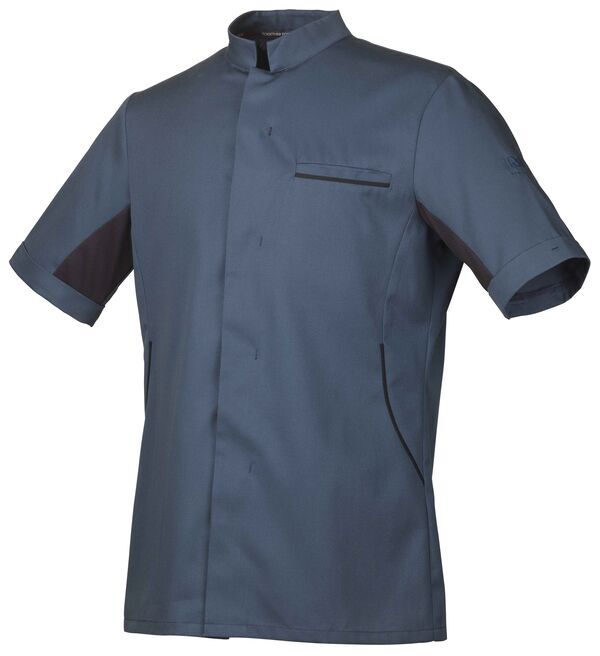 Veste homme à col officier, biais de propreté Seaqual® à l’encolure. Fermeture milieu devant par boutons-pression cachés. Poche poitrine côté gauche. Découpes côtés avec un liseré de couleur. Manches longues finies par poignets et broderie. Empiècement maille sous les bras.