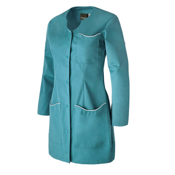 Tunique femme. Encolure fantaisie ton sur ton. Fermeture milieu devant par 5 pressions ton sur ton. 2 poches basses plaquées avec passepoil contrasté. Manches transformables. Coupe cintrée. Longueur : 80 cm.