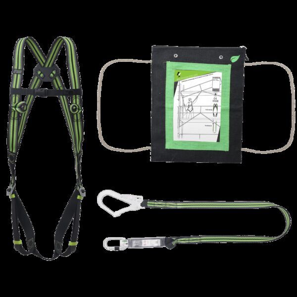 Kit avec harnais 2 points dorsal et boucles sternal, longe en sangle longueur 1,80 m avec absorbeur d'énergie, connecteur acier à vis 18 mm, mousqueton auto double action.