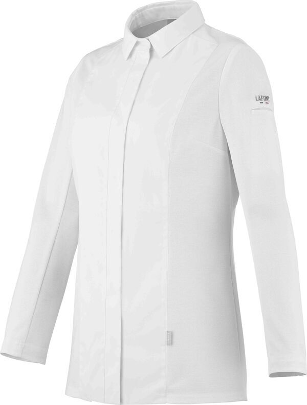 Veste bi-matières femme avec col chemise rabattu. Fermeture milieu devant par boutons-pression cachés. Poche passepoilée sur manche gauche. Ourlet bas de manche 5 cm. Manches et dos en maille piquée. Plastron sergé.