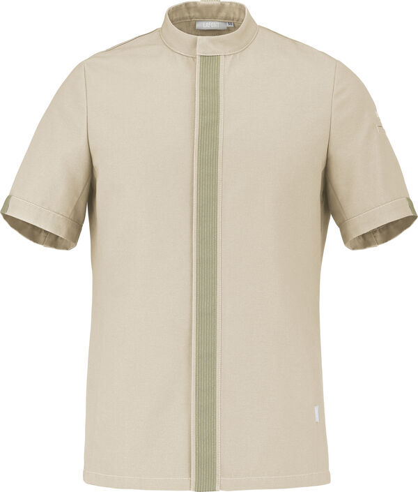 Veste homme à col officier. Fermeture milieu devant par pressions cachées avec galon. Manches courtes. Poche passepoilée sur manche gauche. Patte de maintien du tablier. Fentes au dos.