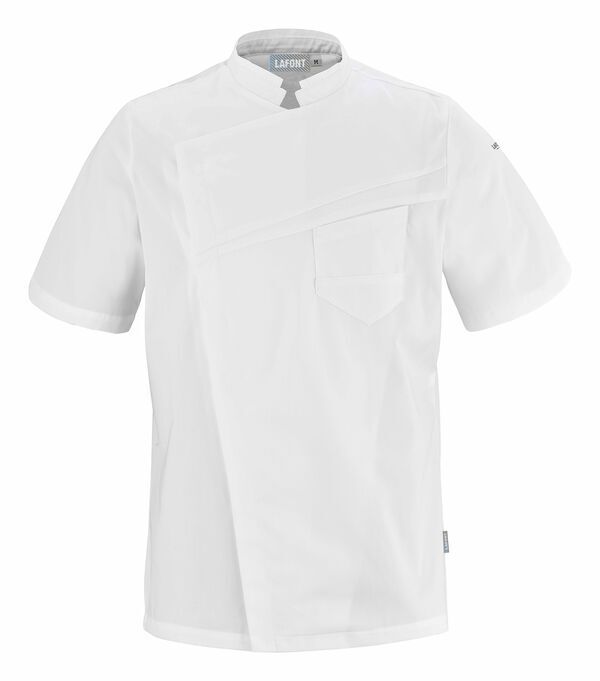 Veste homme bi-matières à double col officier. Fermeture asymétrique par boutons-pression cachés. Manches courtes. Empiècements maille aux épaules et sur les côtés. Bande en bord-côte ajouré milieu dos. Patte de maintien du tablier. Poche passepoilée sur manche gauche. Fentes au dos.