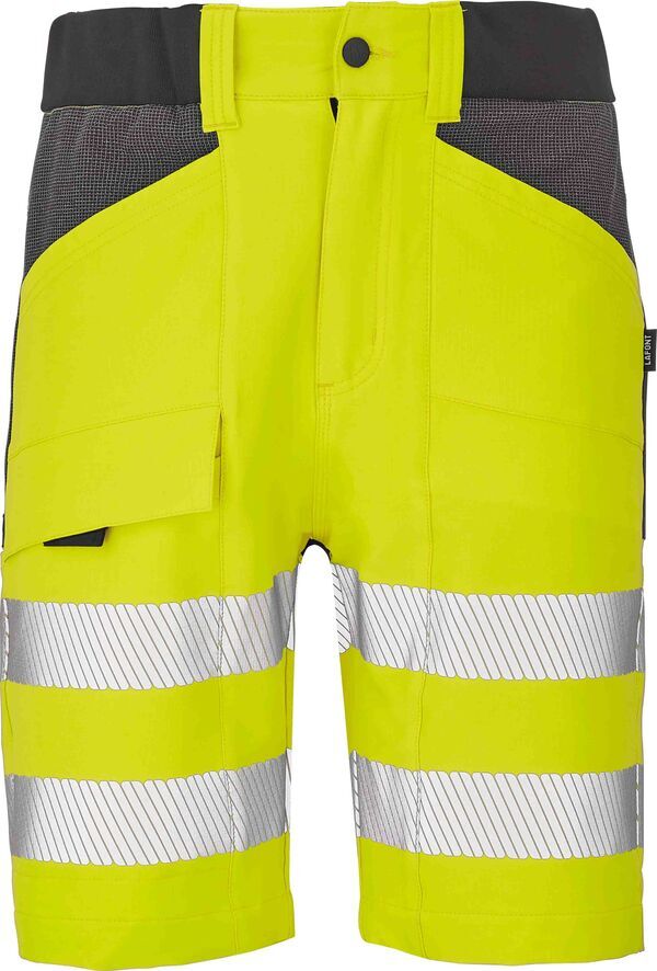 Bermuda haute visibilité stretch. Ceinture élastiquée en bord-côte aux côtés, fermée par bouton rivet et zip. 2 poches italienne. 2 poches cuisses dont une fermée par zip et une par rabat avec auto-agrippant. Poches plaquées arrière. | E.J. : 25 cm.