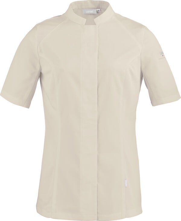 Veste femme bi-matières à col officier plongeant. Fermeture milieu devant par boutons-pression cachés. Manches courtes. Poche passepoilée sur manche gauche. Fentes côtés. Empiècements en maille piquée aux épaules et aux côtés.