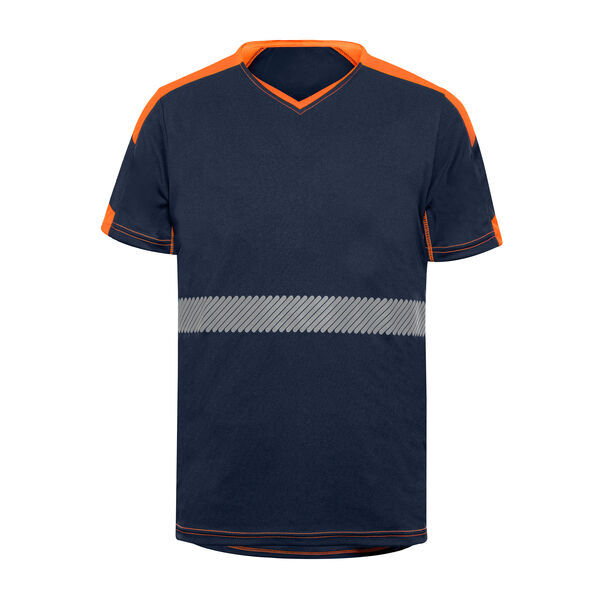 T-shirt de visualisation améliorée. Col V en bord-côte contrasté. Manches courtes. Maille ajourée sous les bras et côtés. Empiècements contrastés sur les épaules, bas de manches et côtés.