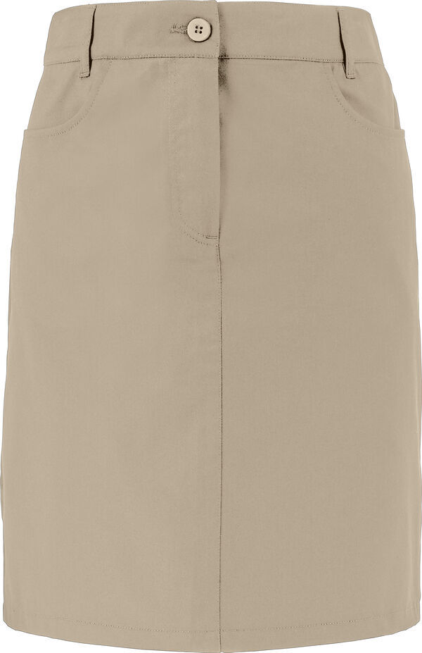 Jupe droite. Ceinture fermée par un bouton et zip. 2 poches cavalières. 2 pinces à l'arrière. 2 poches arrières. Fente d'aisance. Couture milieu avant et arrière. | Coupe droite. Longueur : 52 cm.