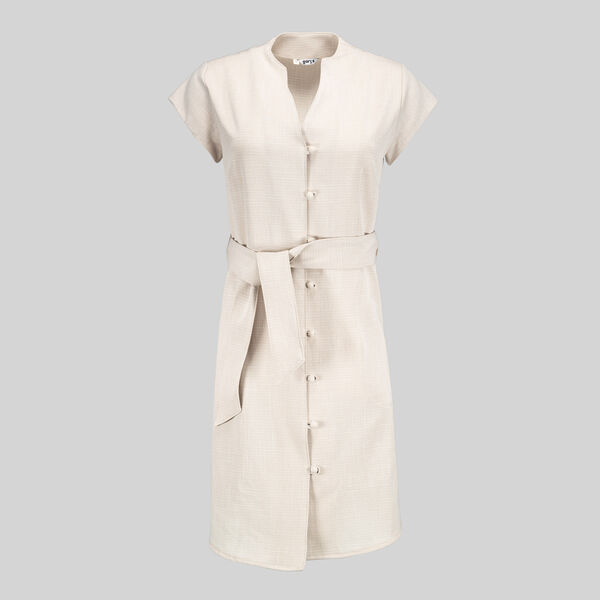 Robe doublée. Col mao ouvert. Fermeture centrale 8 boutons. 2 poches italiennes. Manches courtes. Pinces poitrine avant et au dos. Ceinture à nouer à la taille.