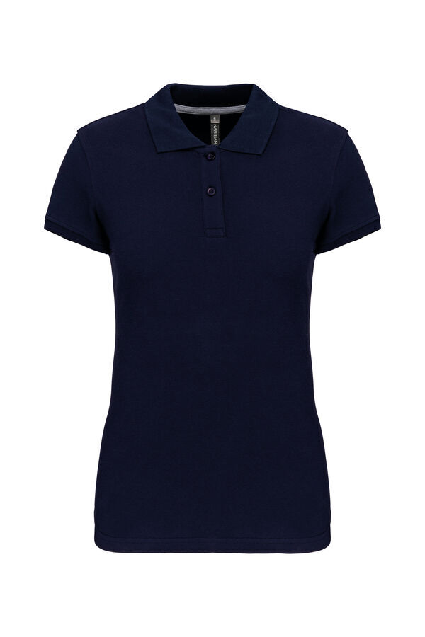 Polo femme col en bord-côte, patte de boutonnage 3 boutons. Bande de propreté contrastée à l’encolure. Fentes latérales. Manches courtes, bas de manche finition en bord-côte. Finition double aiguille bas de vêtement. | Maille piquée.