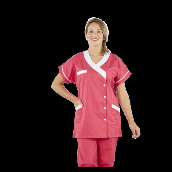 Tunique femme. Col V. Fermeture par 5 pressions calottées. 1 poche poitrine, 2 poches plaquées basses. Parement blanc col, manches, poches. Manches courtes kimono. Longueur : 75 cm