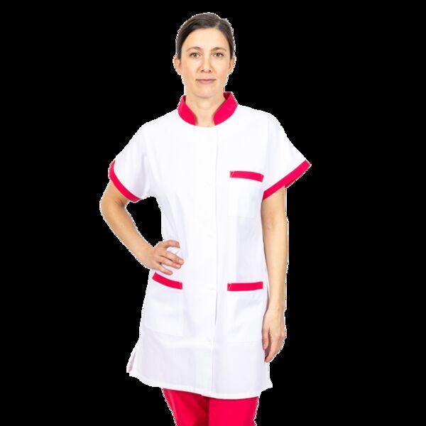 Tunique femme. Col mao contrasté. Fermeture milieu par 5 pressions calottées. Manches courtes kimono. 2 poches basses, 1 poche poitrine avec parement contrasté. Fente aux cotés. Longueur : 85 cm