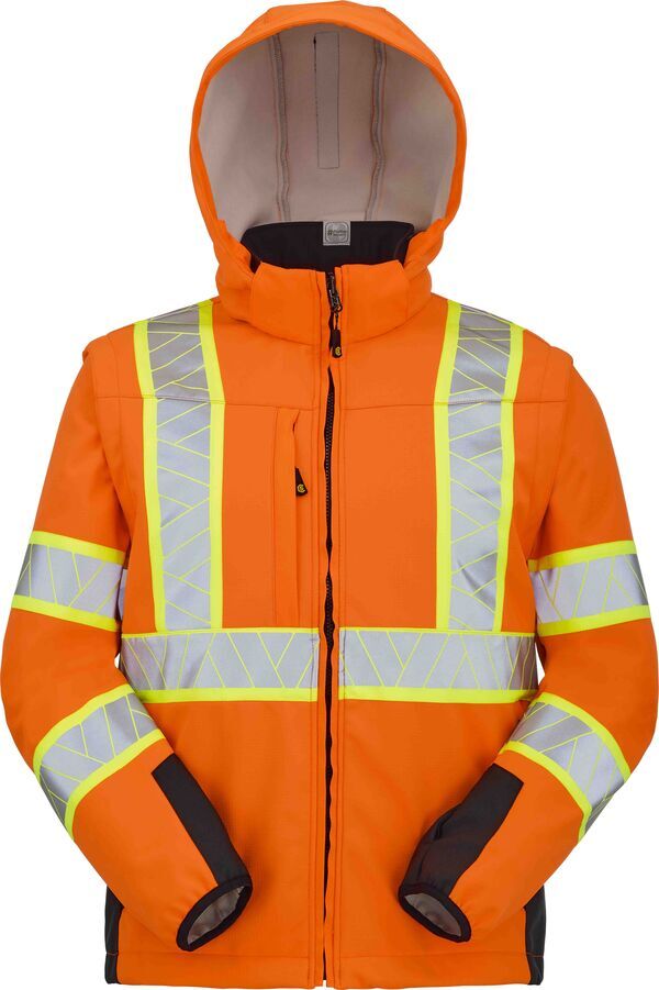 Softshell haute visibilité avec bandes rétroréfléchissantes segmentées contrastées. Manches amovibles. Col montant comprenant une finition col intérieur avec biais. Capuche amovible + patte avec pressions cachées dans le col pour attache capuche. Devant fermé par zip sous double lèvres. Poches zippées côtés sous rabat. Bandes rétroréfléchissantes segmentées de 50mm. Poche intérieure basse. Poche basse avec zip. Bas de manche fini par un biais élastiqué. Dos allongé.