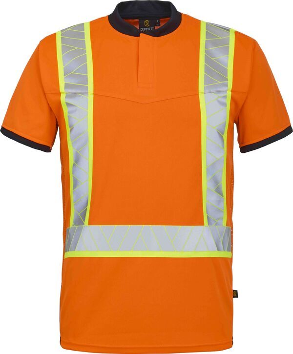 Polo haute visibilité avecbandes rétroréfléchissantes segmentées contrastées. Manches courtes. Col avec patte polo fermée par pressions métalliques cachées avec ruban de renfort. Filet mesh HV sur les côtés. Empiècements contrastés aux côté en bas de vêtement.
