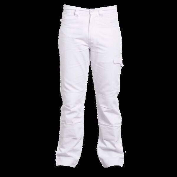 Pantalon poches genoux sans métal. Elastique dos, 2 poches italiennes. Poche plaquée cuisse gauche sous rabat velcro, double poche mètre sur cuisse droite et 1 poche dos sous rabat velcro. Ourlet large.
