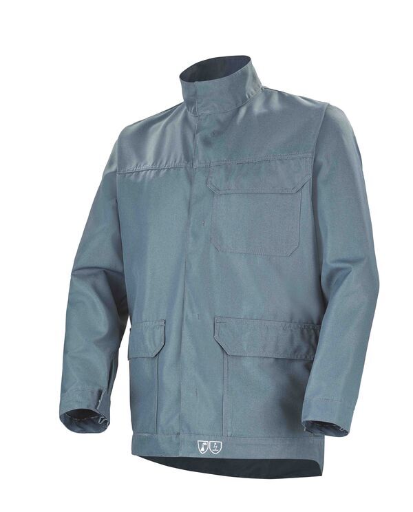 Blouson de travail. Col montant. Fermeture à grippers. Soufflets dos. 1 poche poitrine avec rabat fermé. 2 poches basses à double entrée avec rabats fermés. Ceinture fermée par grippers poignets fermés. Collerette de marquage.