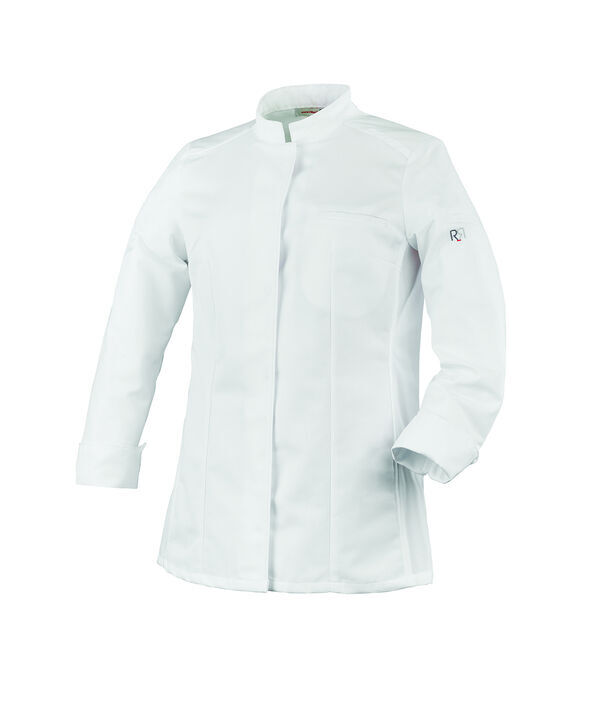 Veste de cuisine femme à col officier contrasté. Fermeture milieu devant par bouton-pression cachés, liseré contrasté. Poche poitrine avec liseré contrasté. Pinces poitrine. Côtés en maille. Manches longues avec poche stylo sur manche gauche et revers bas de manches contrastés. Coupe ajustée.