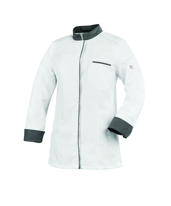Veste de cuisine femme à col officier contrasté. Fermeture milieu devant par bouton-pression cachés, liseré contrasté. Poche poitrine avec liseré contrasté. Pinces poitrine. Côtés en maille. Manches longues avec poche stylo sur manche gauche et revers bas de manches contrastés. Coupe ajustée.