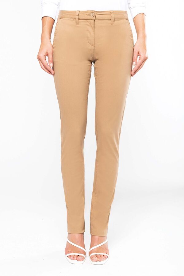 Pantalon chino, coupe femme. Fermeture braguette zippée et bouton cousu. Ceinture avec passants. 2 poches italiennes côtés, dont une avec 1 poche monnaie, 1 poche ticket. 2 poches arrières passepoilées avec piqûre de renfort. Coupe moderne. Finition enzymes.