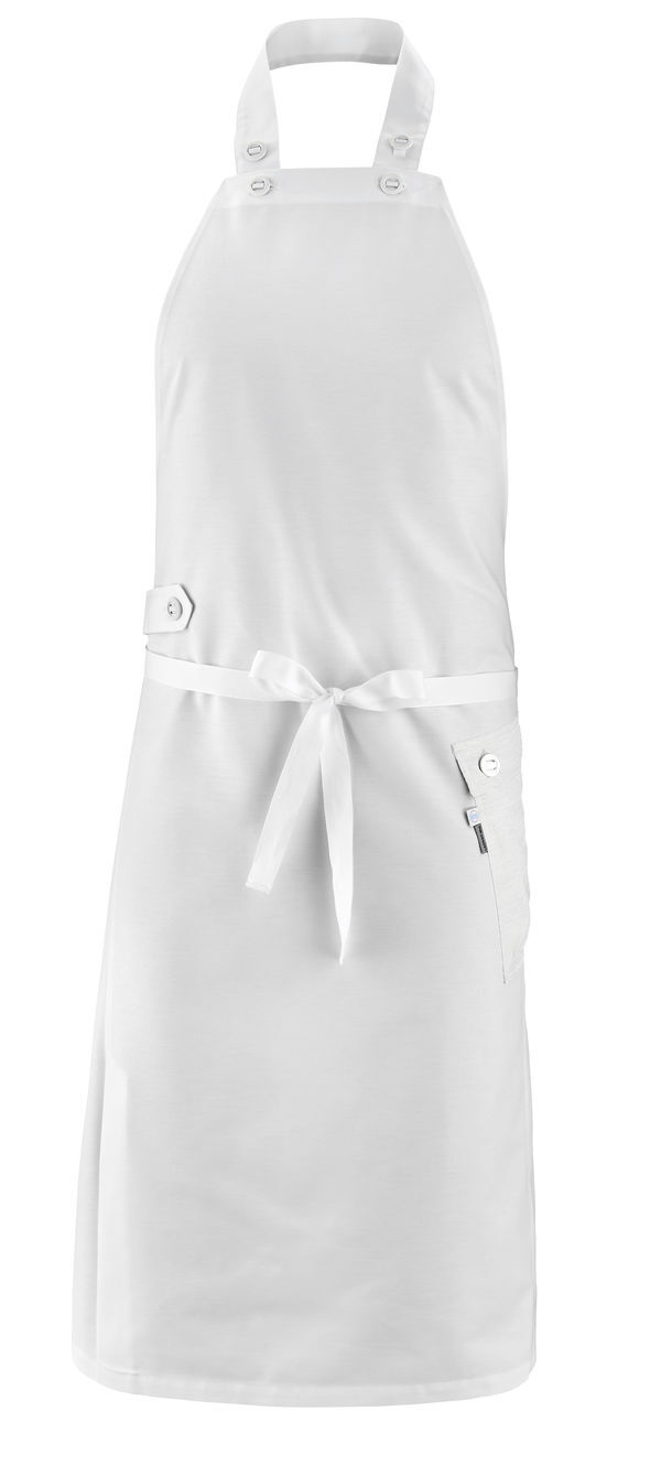 Tablier à bavette. Serrage par sangle à la taille. Galon Bleu/Blanc/Rouge au niveau du bouton du passe-torchon. Poche contrastée avec pinces volume à gauche. Fente d'aisance côté droit. Tablier modulable avec bavette adaptable directement sur les boutons de la veste CANOPEE et bride amovible pour un porter classique. Hauteur : 110 cm. Largeur : 97 cm.