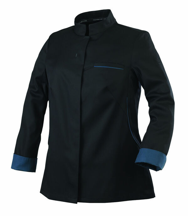 Veste femme à col officier, biais de propreté Seaqual® à l’encolure. Fermeture milieu devant par bouton-pression cachés. Poche poitrine côté gauche. Découpes côtés avec un liseré de couleur. Manches longues finies par poignets et broderie. Empiècement maille sous les bras.