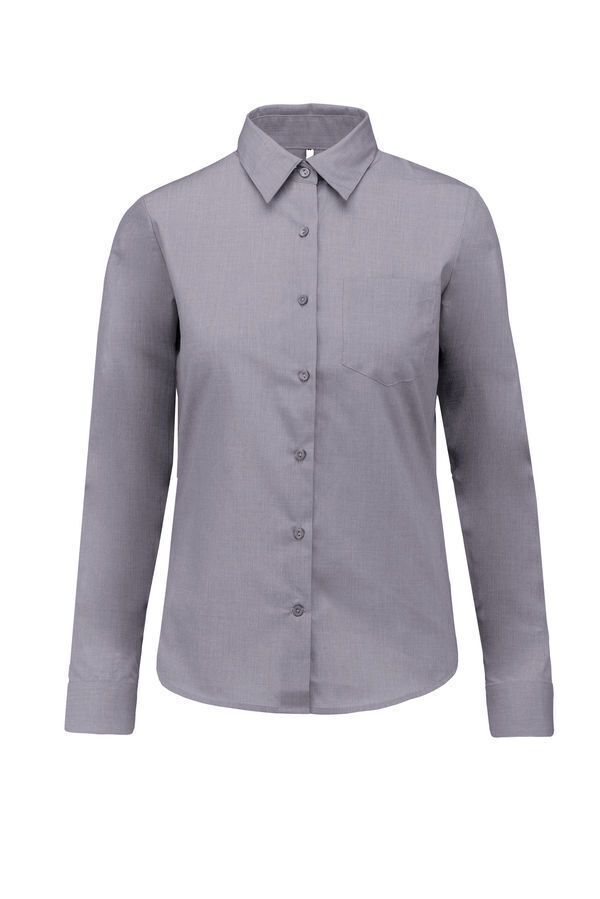 Chemise femme. Col chemise non boutonné. Boutons ton sur ton. Poche poitrine côté gauche en V. Poignet réglable à angles arrondis avec patte de manche indéchirable. 1 bouton de rappel. Bas arrondi.
