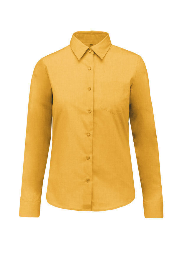 Chemise femme. Col chemise non boutonné. Boutons ton sur ton. Poche poitrine côté gauche en V. Poignet réglable à angles arrondis avec patte de manche indéchirable. 1 bouton de rappel. Bas arrondi.