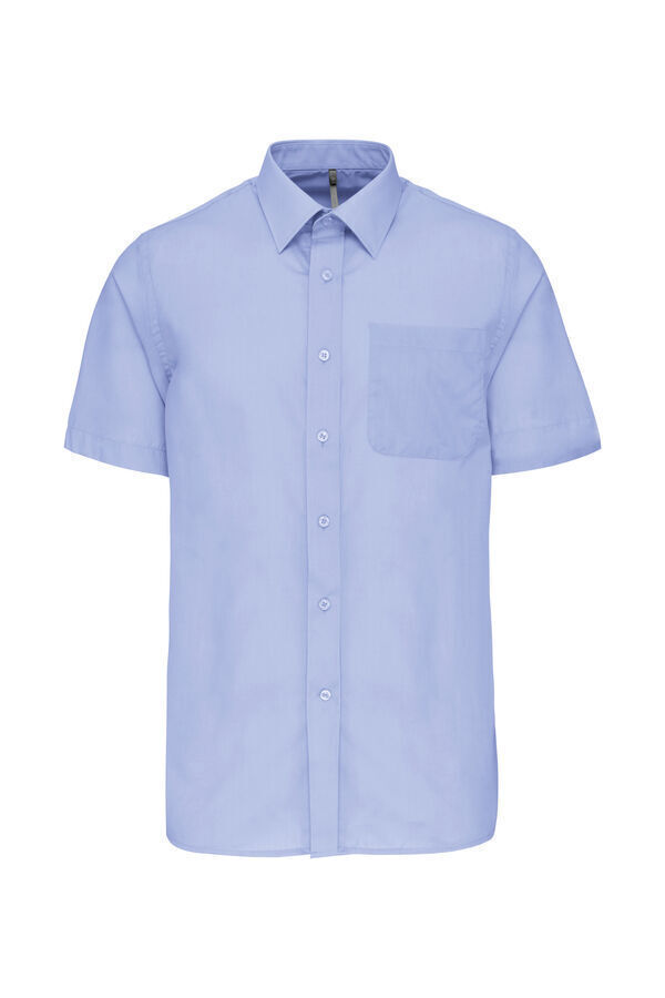 Chemise homme. Col chemise avec pointe de col baleinée. Fermée par 8 boutons ton sur ton avec patte de boutonnage à revers. Poche poitrine. Manches courtes. Empiècement dos en double.