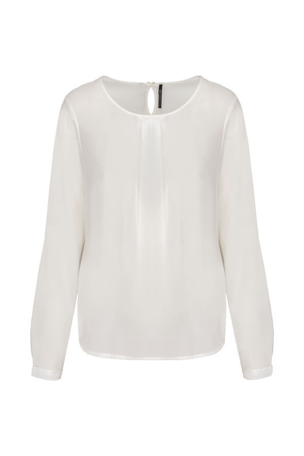 Blouse femme en crêpe. Encolure ronde avec biais. Petites fronces à l'encolure devant. Fermeture à l'arrière et au bas de manches par 1 bouton recouvert.
